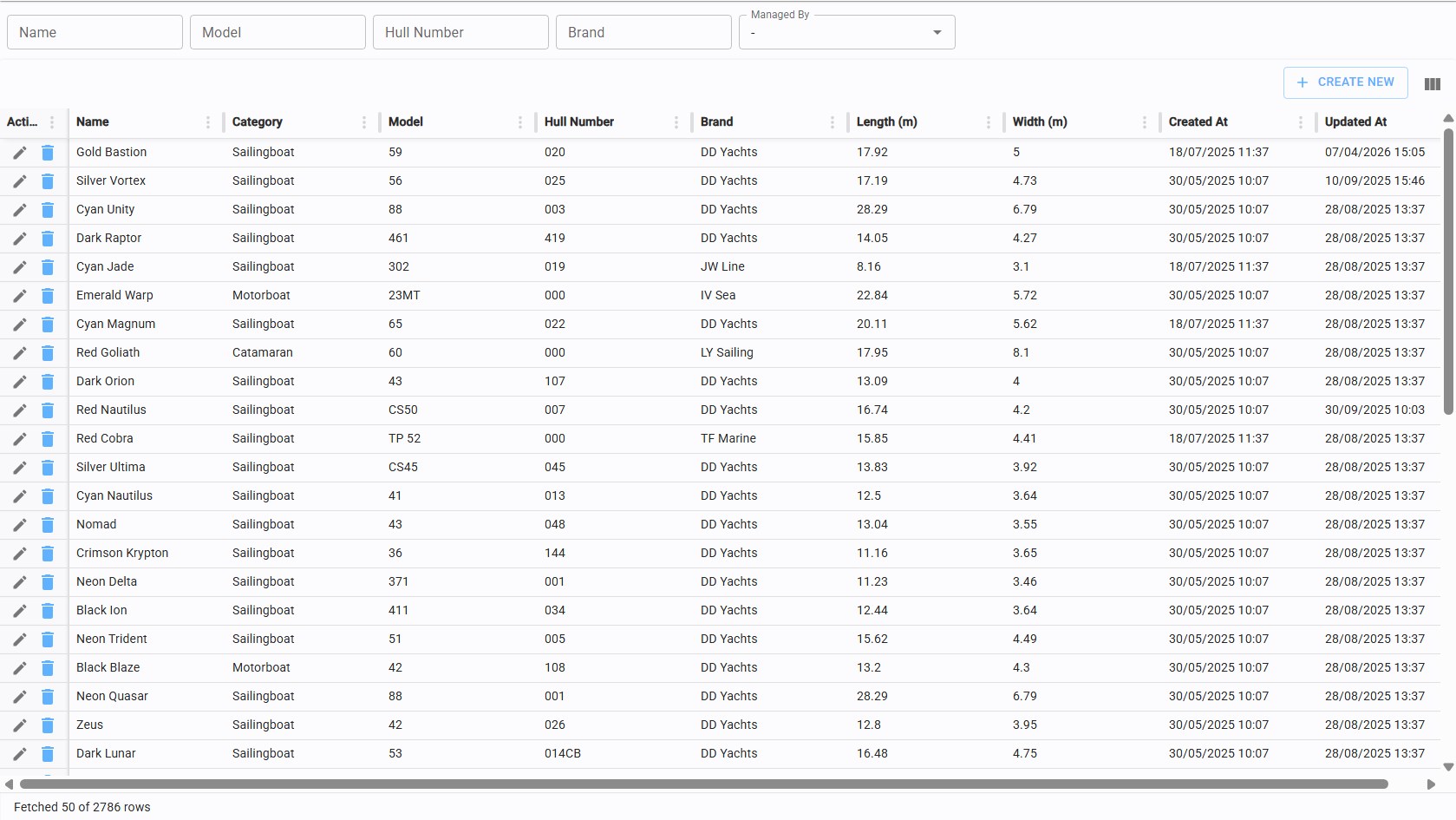 The Yacht List page provides a comprehensive overview of all registered boats. From this view, you can create new boat records or access the edit and deletion functions for existing ones.