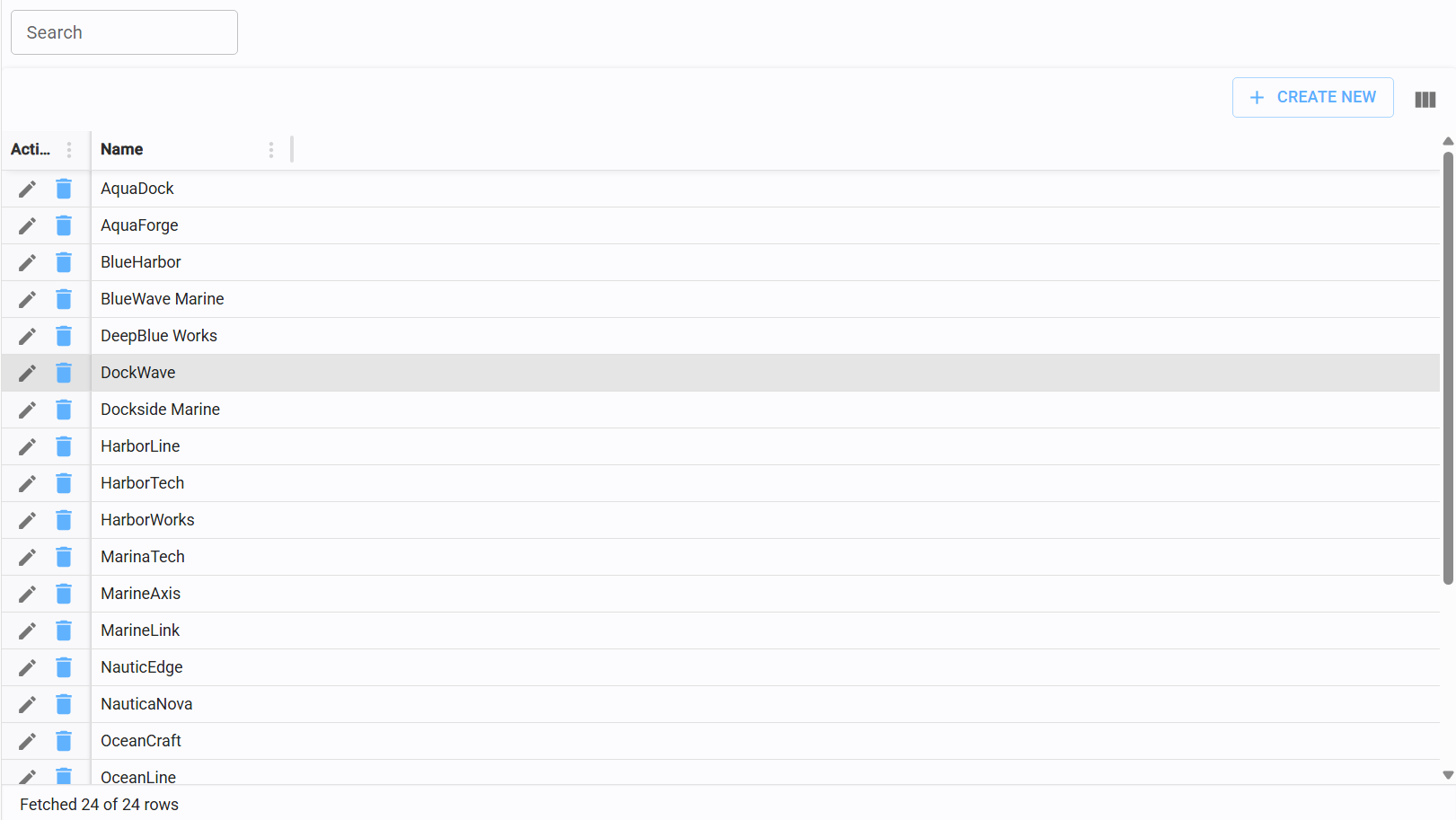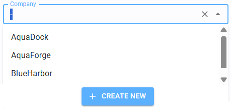 To register a new company, click the "Create New" button in the top-right corner of the table and enter the Name in the edit form.