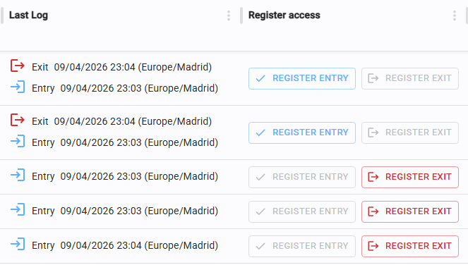 Click "Register Entry" or "Register Exit" in the corresponding row to log an event.