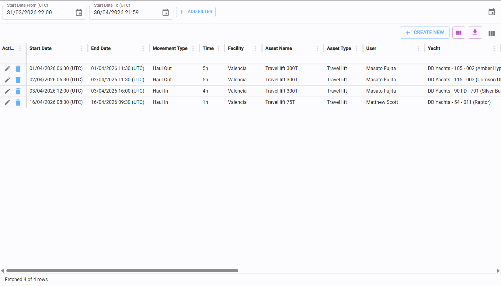 To create a new booking, click the "Create New" button located in the top-right corner above the table.