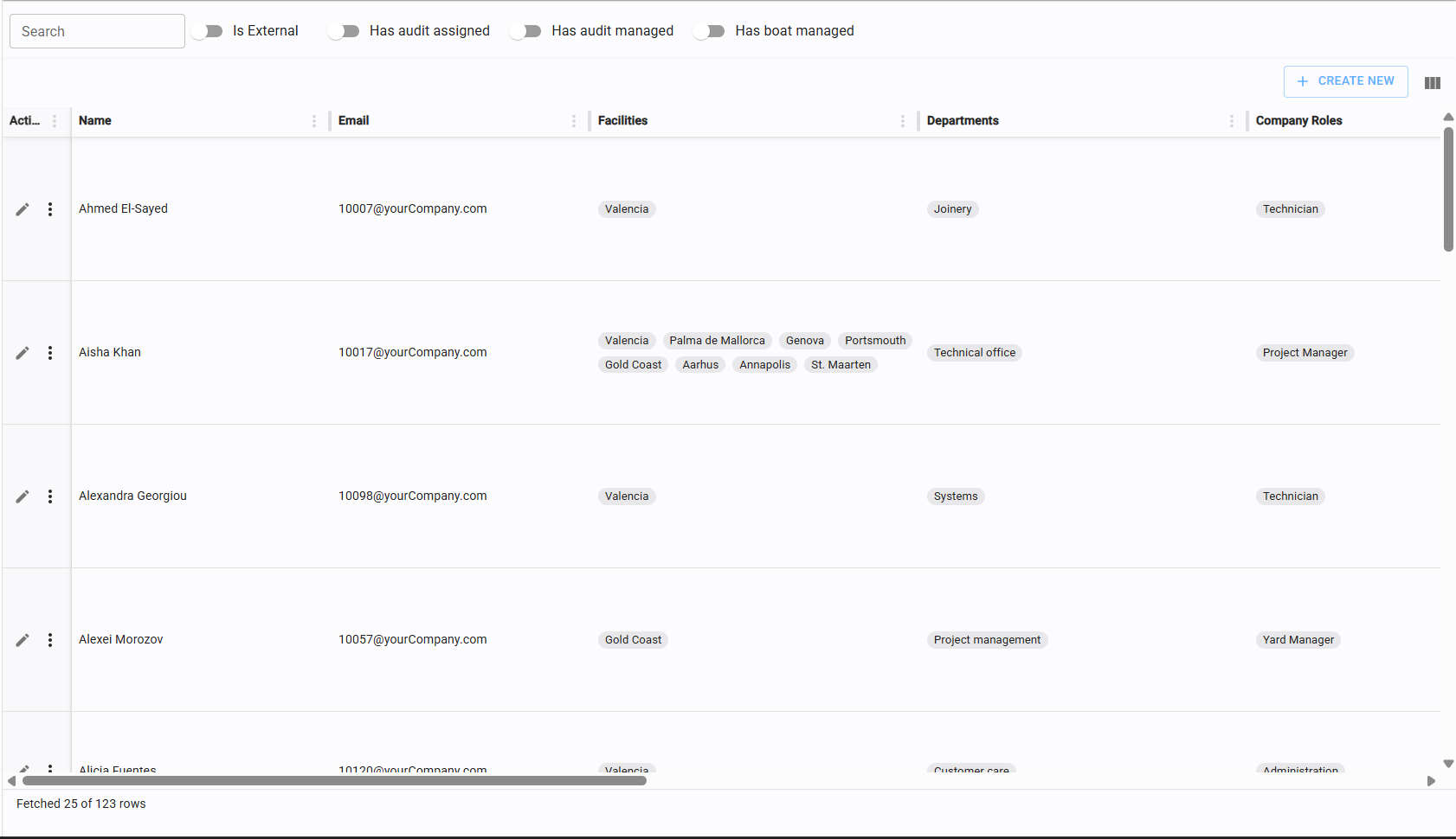 Each Company Role is built by grouping System Roles. A System role represents a predefined set of permissions that is coupled with some system functionality, for example a "Boat Admin" system role grants full rights over the Yacht section.