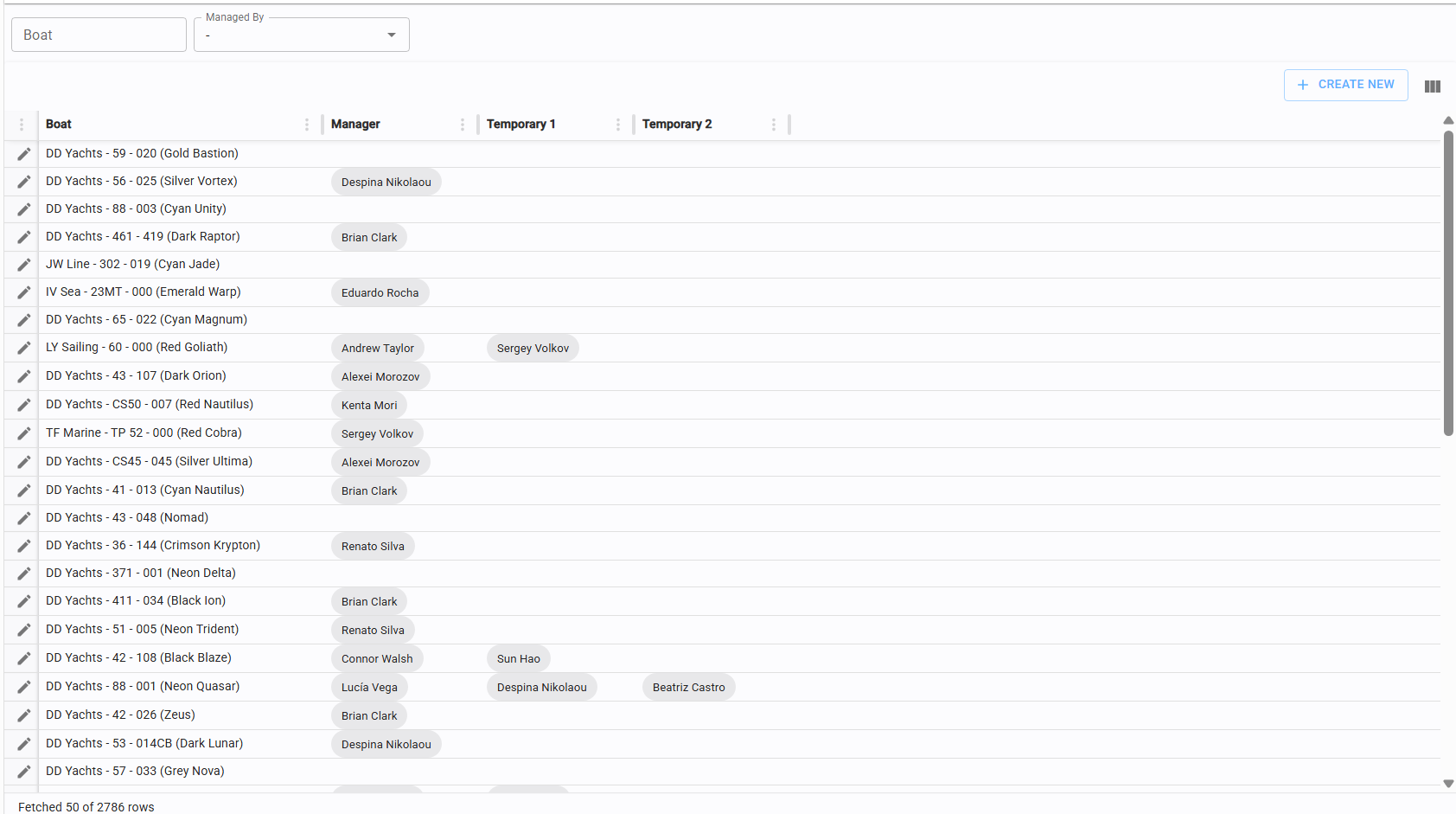 Click "Create New" in the top-left corner of the table to link a manager to a yacht.